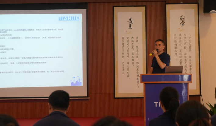 On the morning of August 4, Tianjie Industrial held a company-wide learning conference on the theme of “quality management.” The conference summarized the achievements and issues of quality work in the first half of the year and further clarified the direction ofquality management improvements in the second half of the year. Company leader sand all employees participated, demonstrating the company's high regard for and firm determination toward quality management.