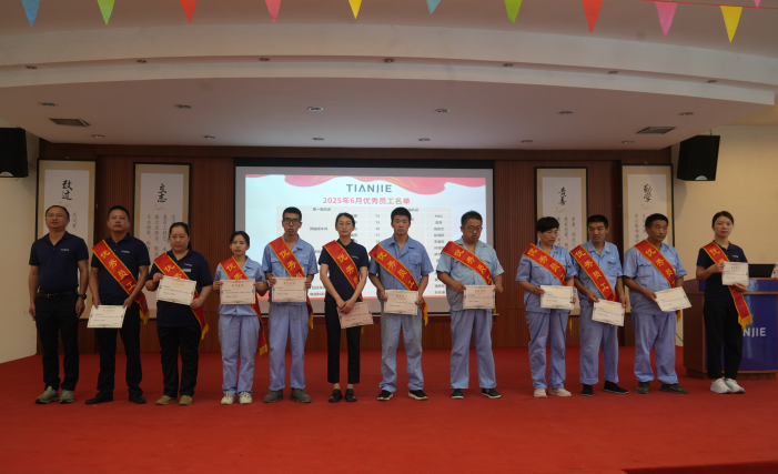 会议伊始,公司对六月先进员工进行表彰。汗水浇灌成果,榜样引领前行,全体员工以先进为标杆,将奋斗精神转化为实际行动。随后,会议公布 5-6 月“师带徒” 及出师人员名单,彰显了天杰“以老带新、文化传承” 的管理理念。
