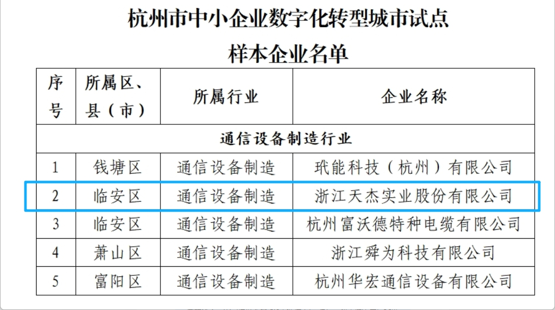 此次入选,标志着天杰实业在通信设备制造领域的数字化转型成效获得了权威认可。未来,公司将继续深化新一代信息技术与制造业的融合创新,致力于打造可复制、可推广的行业数字化转型样板,为杭州市乃至全省中小企业数字化升级贡献示范力量。